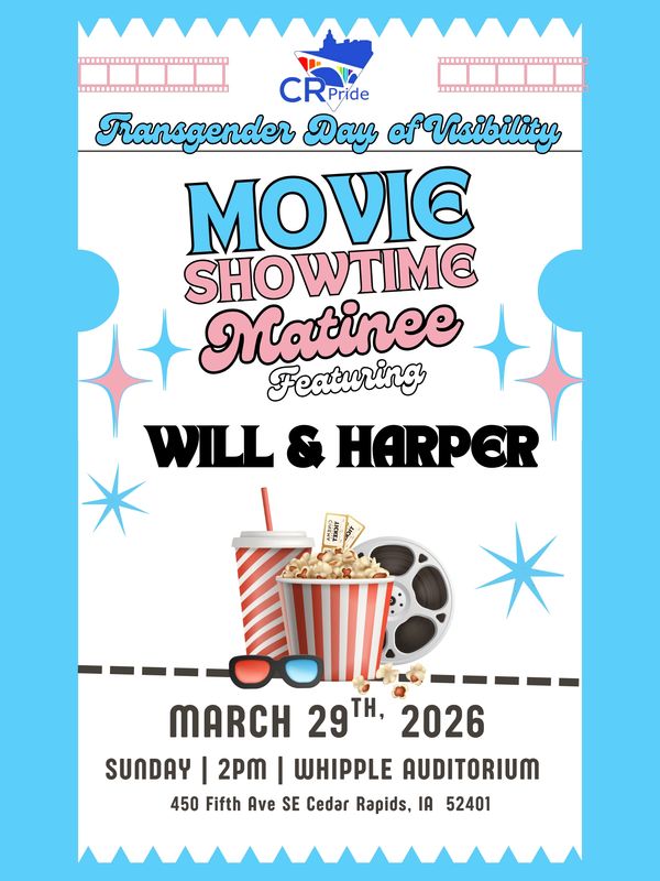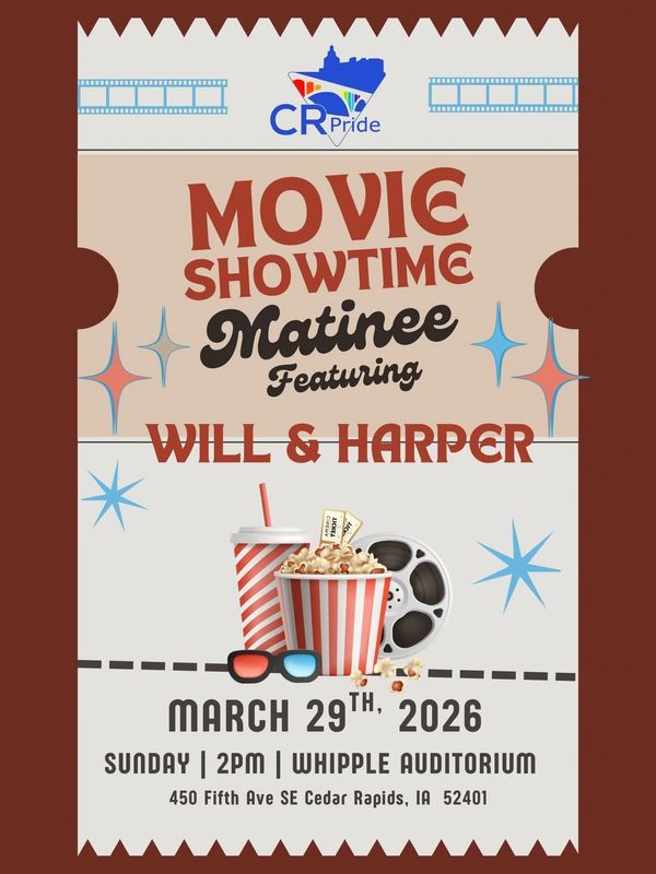 Join CR Pride for a special screening of Will & Harper, a powerful and heartfelt documentary that follows longtime friends Will Ferrell and Harper Steele as they set out on a cross-country road trip. Along the way, they explore friendship, identity, and what it means to show up for one another during moments of change. The film blends humor with honest, meaningful conversations and offers an affirming look at trans joy and allyship.
