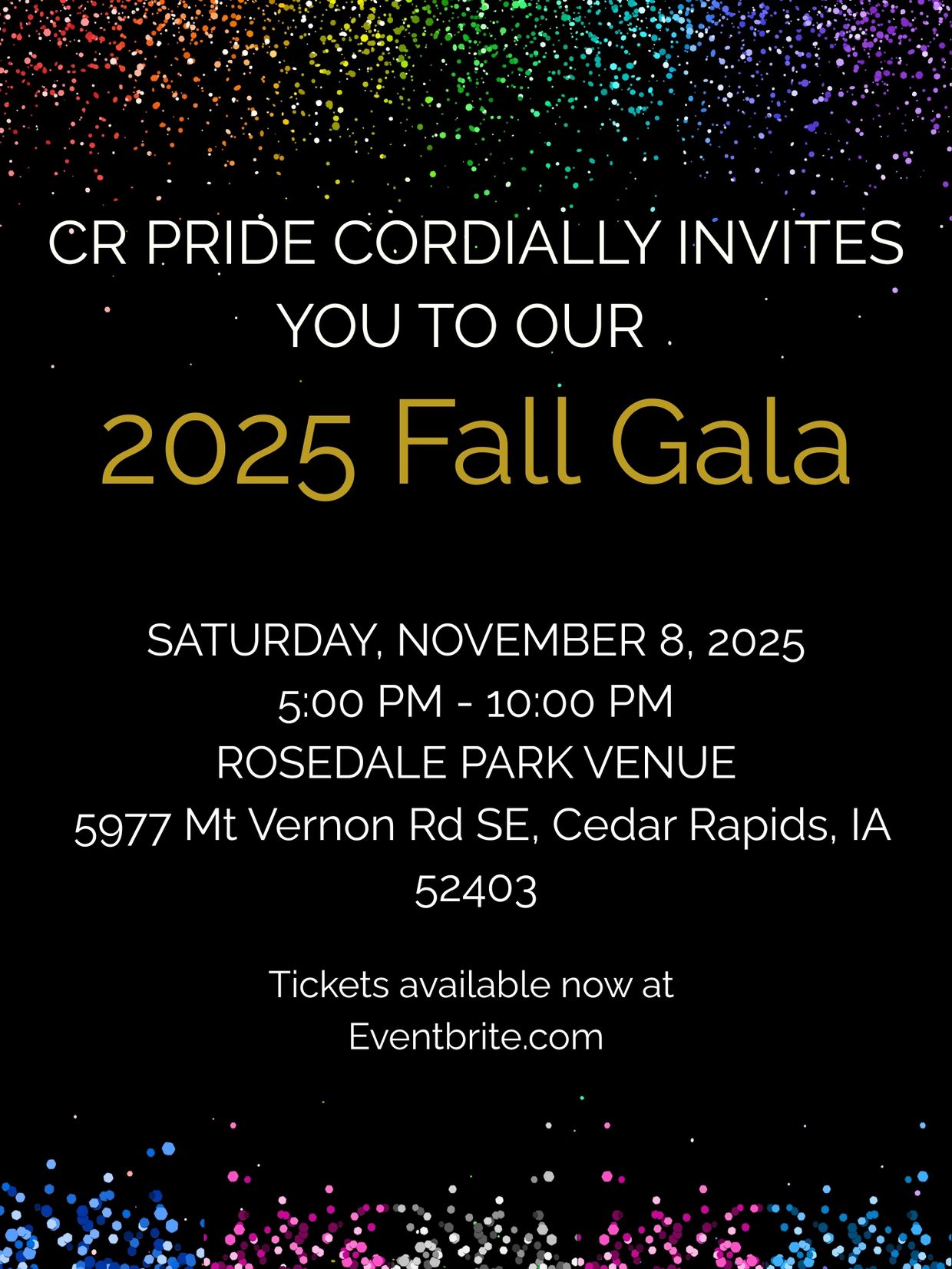 The CR Pride Gala isn’t just a night out — it’s a chance to invest in visibility, equality, and community. Your attendance helps strengthen CR Pride’s year-round efforts to support and uplift LGBTQIA+ individuals across Eastern Iowa.